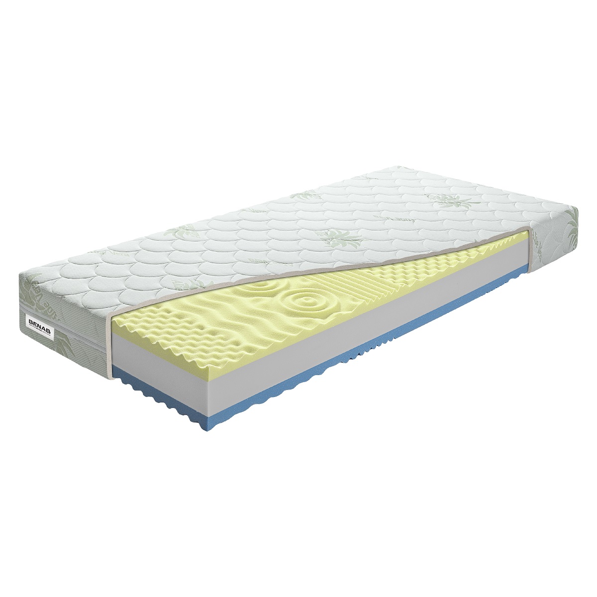 Veľmi obľúbený zdravotný sendvičový matrac z VISCO elastickej pamäťovej peny so 7 zónovou anatomickou profiláciou v kombinácii s jadrom PUR peny. • VISCO pena s pamäťovým efektom reaguje na teplo a tlak a optimálne sa prispôsobí krivkám Vášho tela čím uvoľňuje svalstvo a kĺby • matrac je obojstranne použiteľný, profilovaný a cenovo dostupný • povrch obojstranne tvarovaný masážnou profiláciou • odporúčaný rošt lamelový • štandardné vyhotovenie v poťahu - Aloe Vera • VISCO 52 kg/m3 7 zón profil, PUR jadro 30 kg/m3, PUR 7 zón 30 kg/m3 Poťah - ALOE VERA • poťahová látka s výťažkami z tejto rastliny obsahuje prevažne enzýmy, minerálne látky a aminokyseliny, ktoré veľmi pozitívne pôsobia na pokožku a posilňujú relaxačné účinky spánku • príjemne mäkký poťah so schopnosťou regenerácie pokožky ľudského tela, vlastnosti tejto látky zaručujú dostatočnú hygienu • certifikovaný a zdravotne nezávadný OEKO-TEX štandard • zloženie: 85 % polyester; 15 % viskóza, obohatený o výťažky z aloe vera, poťah prešitý s klimatizačnou výplňou, PES vláknom 250 gr/m2 • antibakteriálny, antiroztočový, odzipsovateľný a prateľný do 60°C