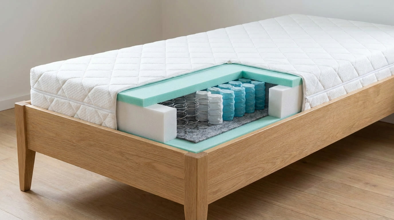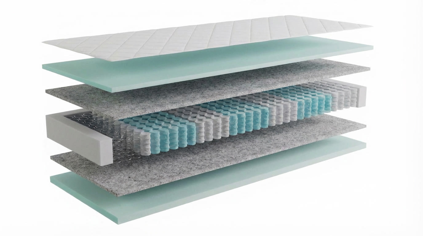 Jadro matraca kombinuje kvalitnú PUR penu s hustotou 38 kg/m³ a taštičkové pružiny (STANDART POCKET), čo zabezpečuje vynikajúcu flexibilitu a ideálnu podporu. PUR pena sa dokonale prispôsobuje tvaru vášho tela a reguluje teplotu počas spánku, čím vytvára zdravé a pohodlné prostredie bez nadmernej vlhkosti.